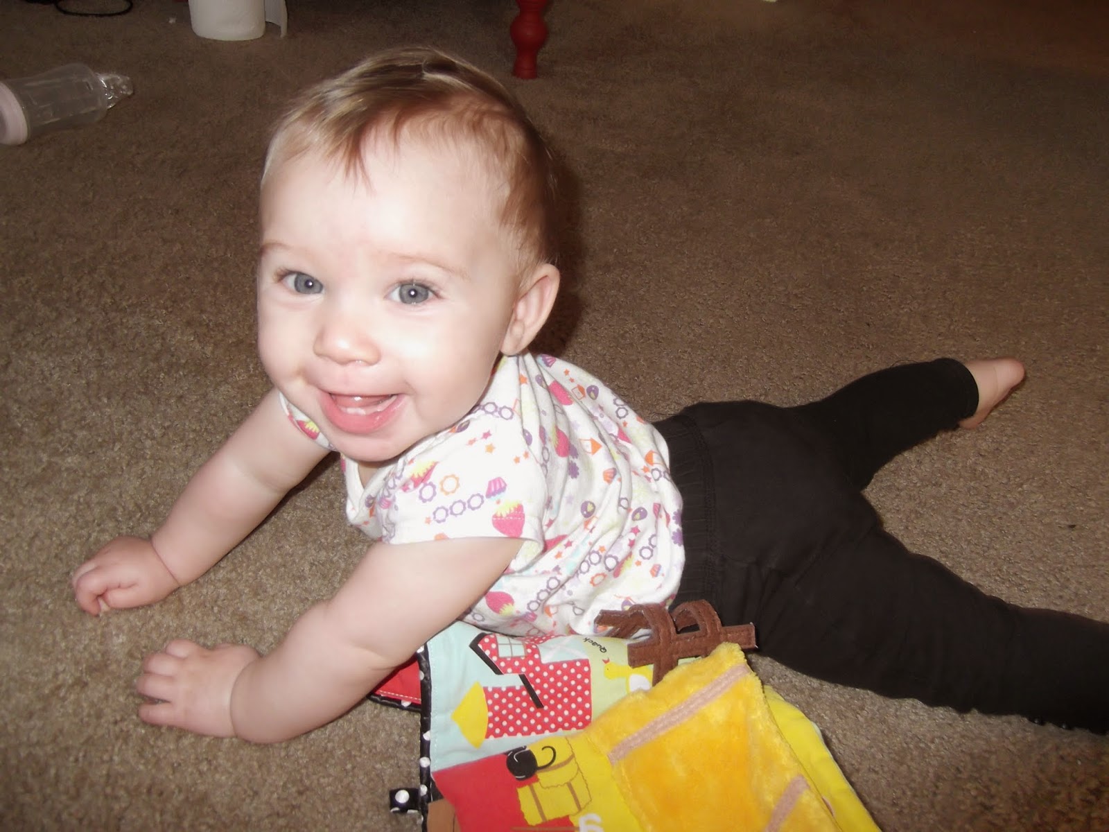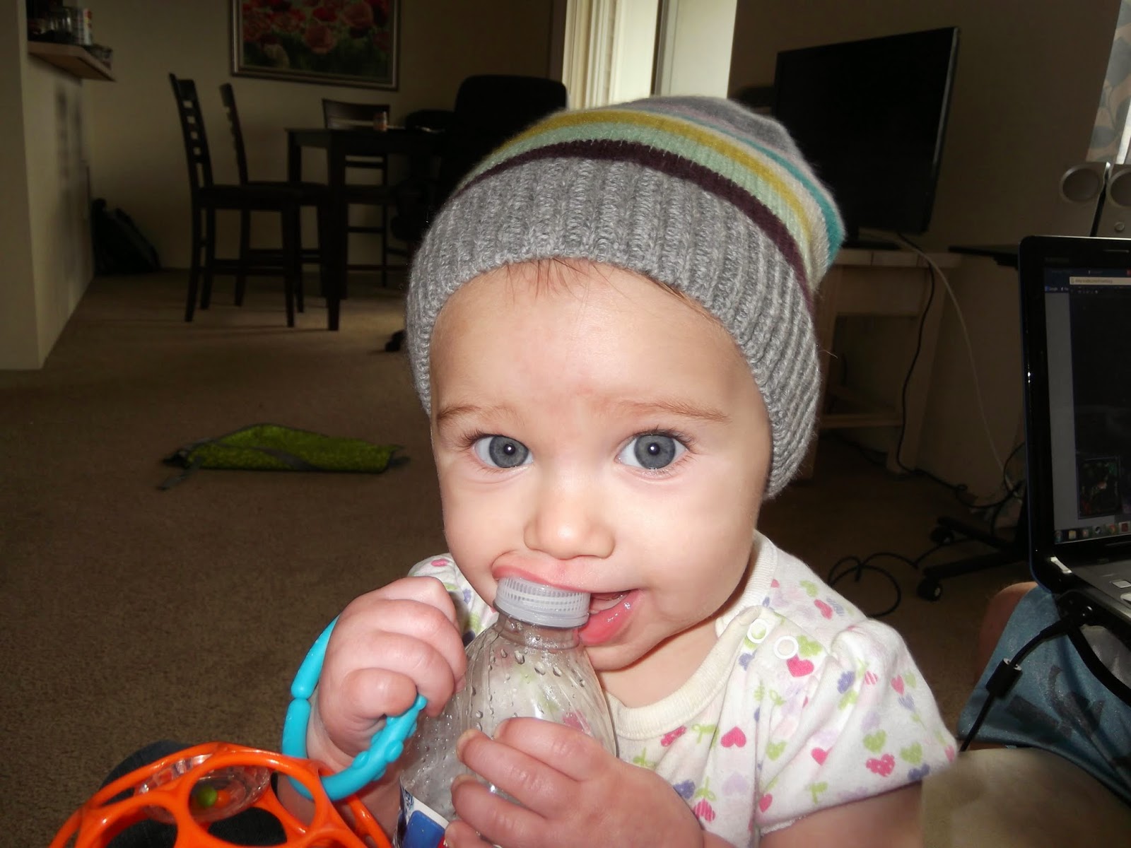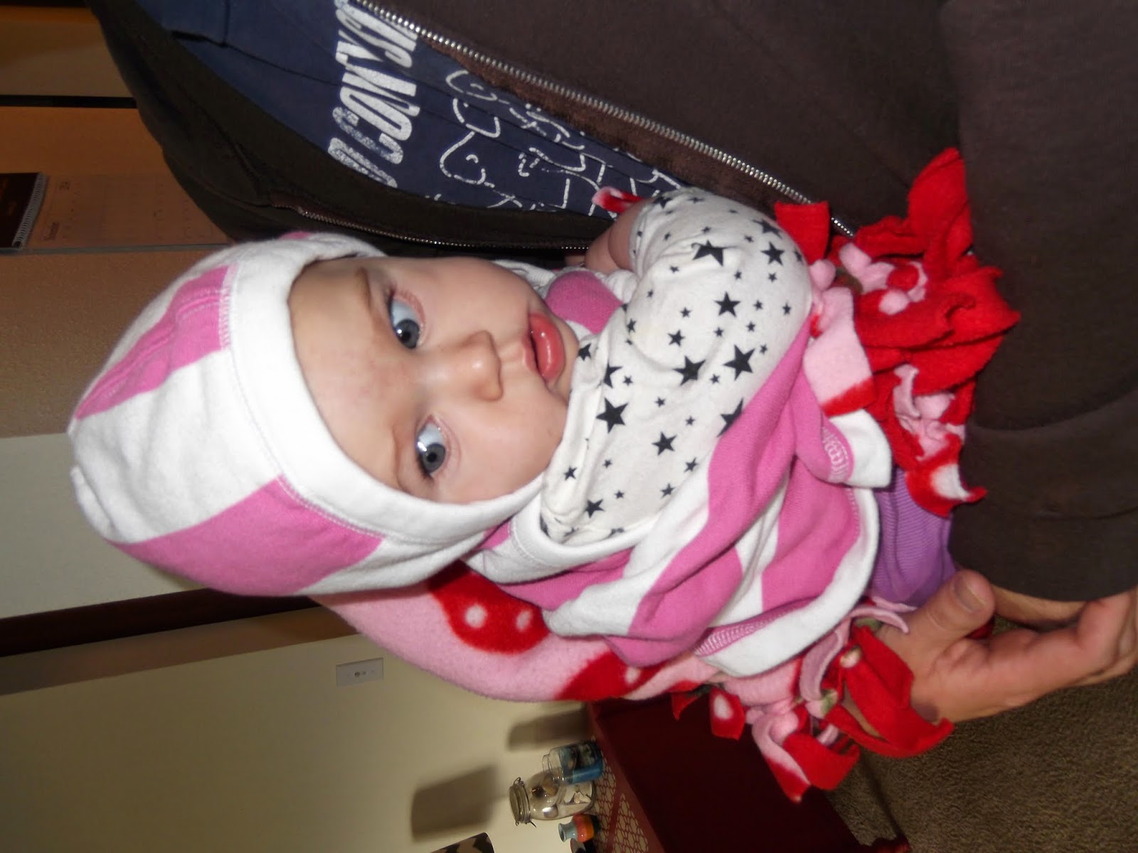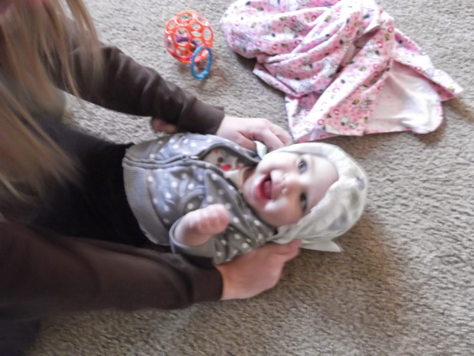 Pictured below is Audrey with her diaper bonnet! She loves diaper bonnet.
