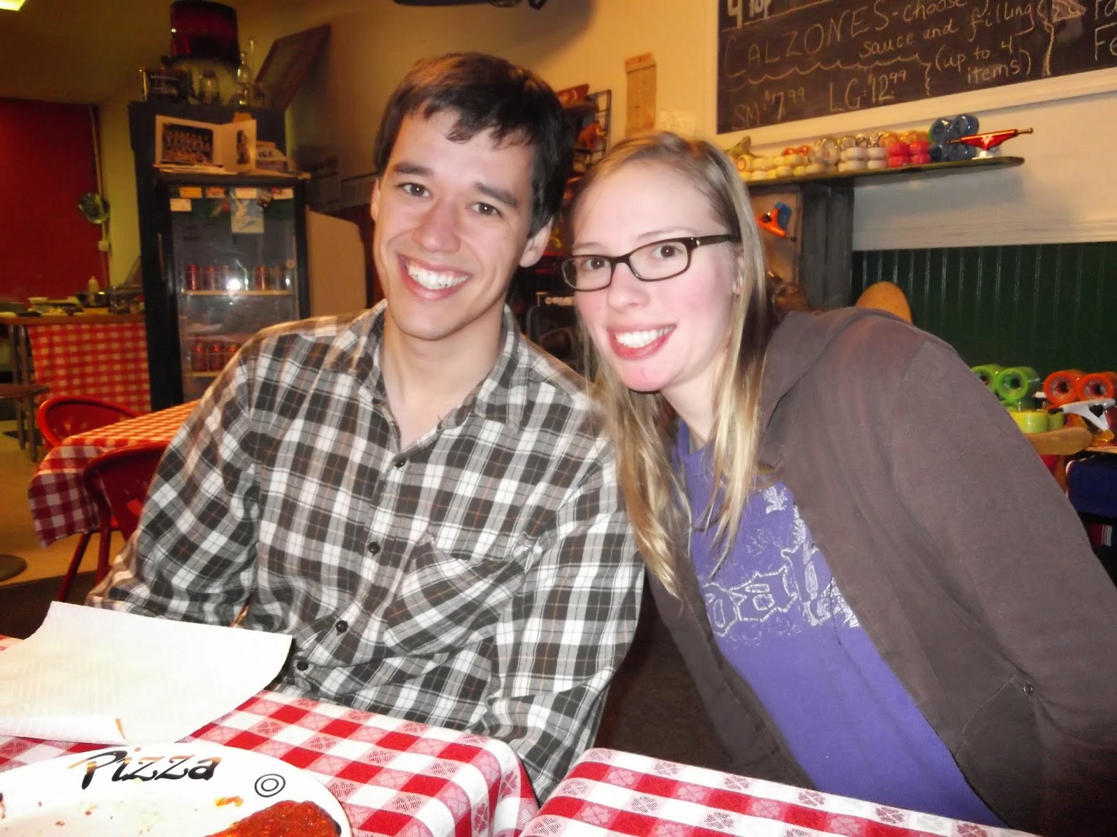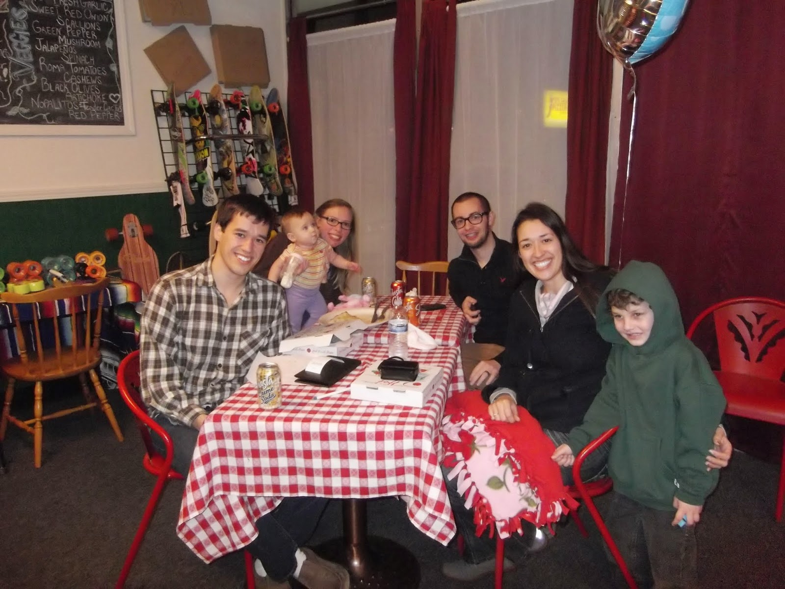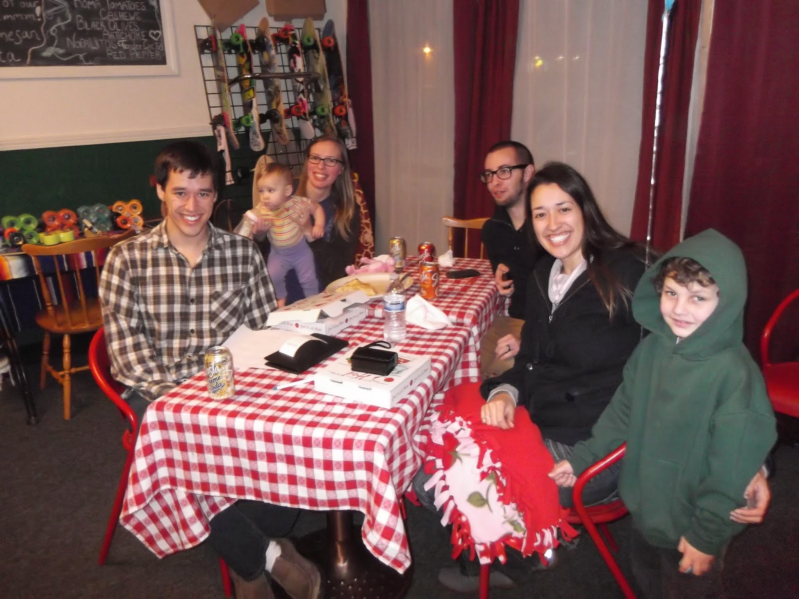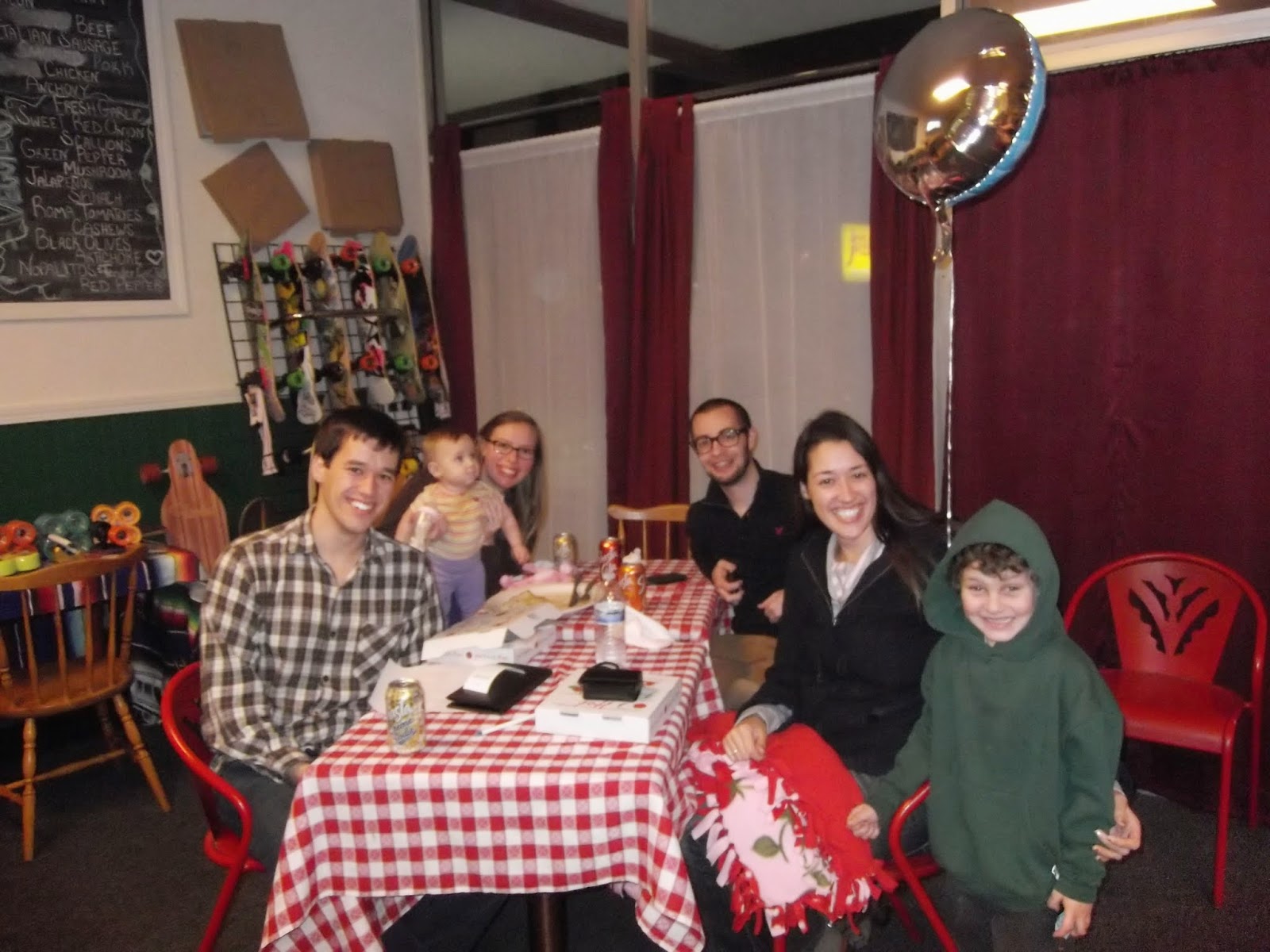 James, Tammy, and Audrey came to visit us for Thanksgiving. The day before Thanksgiving was my birthday. James and his family came in around 4pm. We all went out to dinner later that night at a little family owned restaurant that Tyler and I had been to once before. The place is great. It is ran by a married couple whose son is pictured with us below. They also have a teenage daughter, I think. Eating there feels like you are in their living room, they crack us up. They chat with you and are really nice people. And you get free sodas and breadsticks, so that doesn't hurt much either! Coicidentally, it was their little boy's birthday on the same night as mine! they had a little table with balloons set up for him. So I had to get a picture with him for my blog! Tyler and I ordered a calzone to split, and James and Tammy did the same. They are super yummy, because you build your own, choosing the sauce, and all the meat and vegetables inside. So good.
